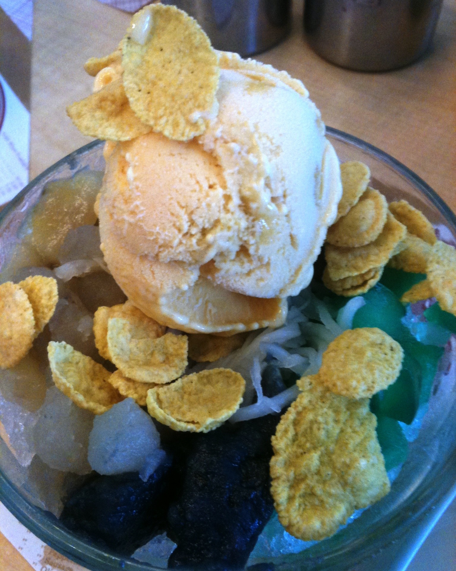 The next strange food I tried was Halo-Halo. It’s always served in a large round bowl with a tall stem. It starts with crushed ice, then several scoops of different kinds of gelatin and fruits, topped with mango ice cream and sprinkled with cornflakes. To ready it for eating, you sprinkle it with sugar and pour cream over the whole thing, mix it together, and eat. This dessert is definately a fail to my taste buds. Looks great in the glass, but it turns out the gelatin is flavored like vegetables (unidentifiable vegetables at that), the fruit part isn’t sweet, and pouring cream into ice just gives you watered down cream. I ate the ice cream and the cornflakes and that was enough. The local people we were eating with cleaned their bowls, getting every little bit out. It is apparantly an incredibly popular local dessert. (I just looked it up on Wikipedia. Even allowing for the slight differences between their description and what I ate, the details don’t sound very appetizing. My version DID have kidney beans in it, I just did not recognize them as such since they were buried in a *dessert* of all things. Anyway, here is the Halo-Halo Wikipedia article.)