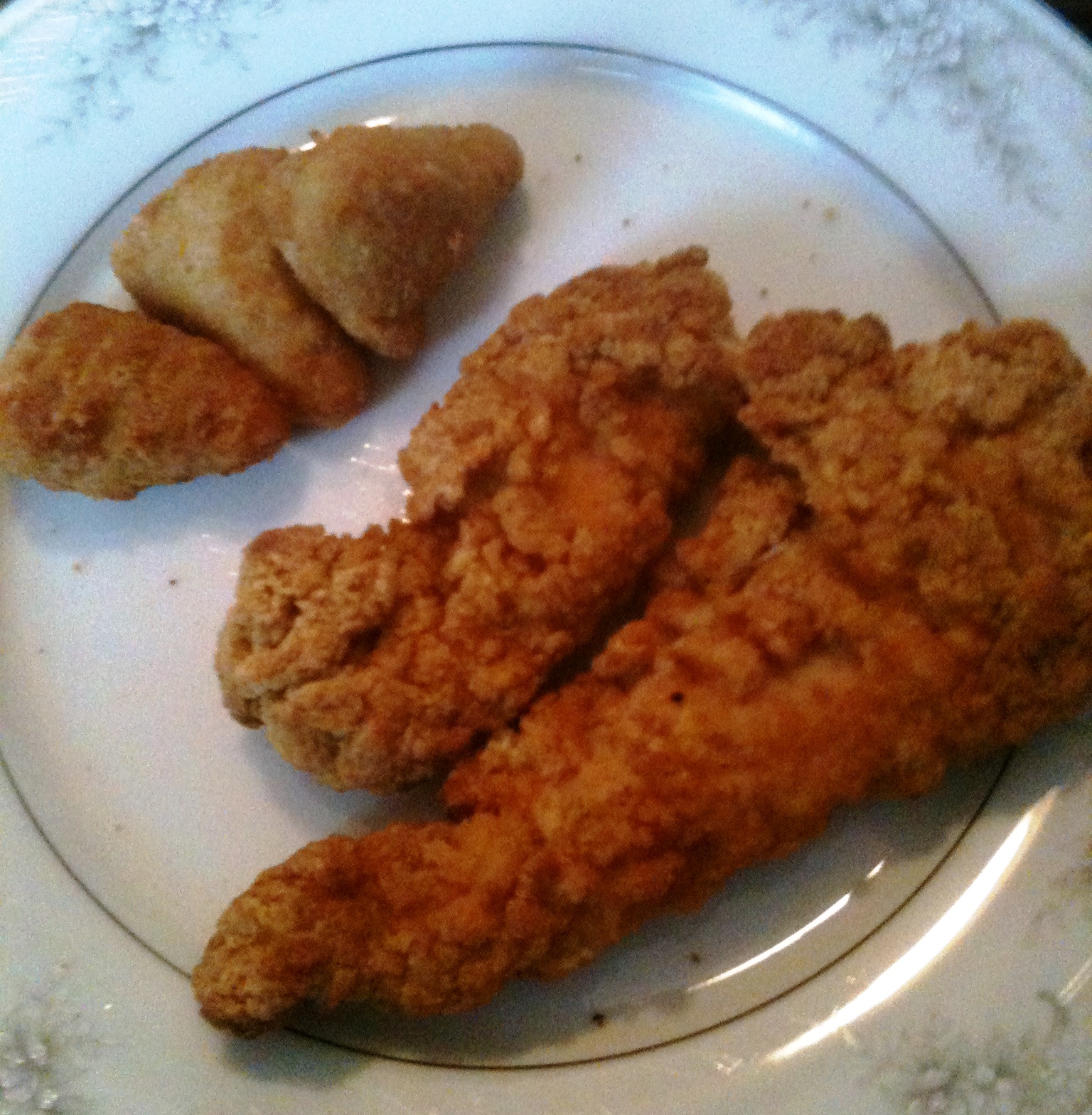 But, the hashbrowns aren’t cooking. Gah! Instructions told me to heat oil to medium heat in a skillet, then sprinkle hashbrowns into the skillet until they are half an inch deep. Let cook without disturbing them until the edges brown, then turn the hashbrowns, and continue cooking until done. I couldn’t do that – the sprinkling part, that is. The hashbrowns were frozen in a solid lump. So I microwaved them until they could be pulled apart with a fork, and added them by forkfuls to the skillet. Aparantly that isn’t close enough to work, because although the edges turned brown, they were also stuck tight to the bottom of the skillet and could NOT be turned. The ones that weren’t stuck were still uncooked. So, scrap the hashbrowns because the chicken and jalapeno bites were finished, so I just served them. (Note: I don’t care for the jalapeno bites, but hubby liked them, so that’s OK.) Hubby ate the chicken strips with ranch dressing, I ate mine with honey. Yum. It’s nice to sit and eat dinner.