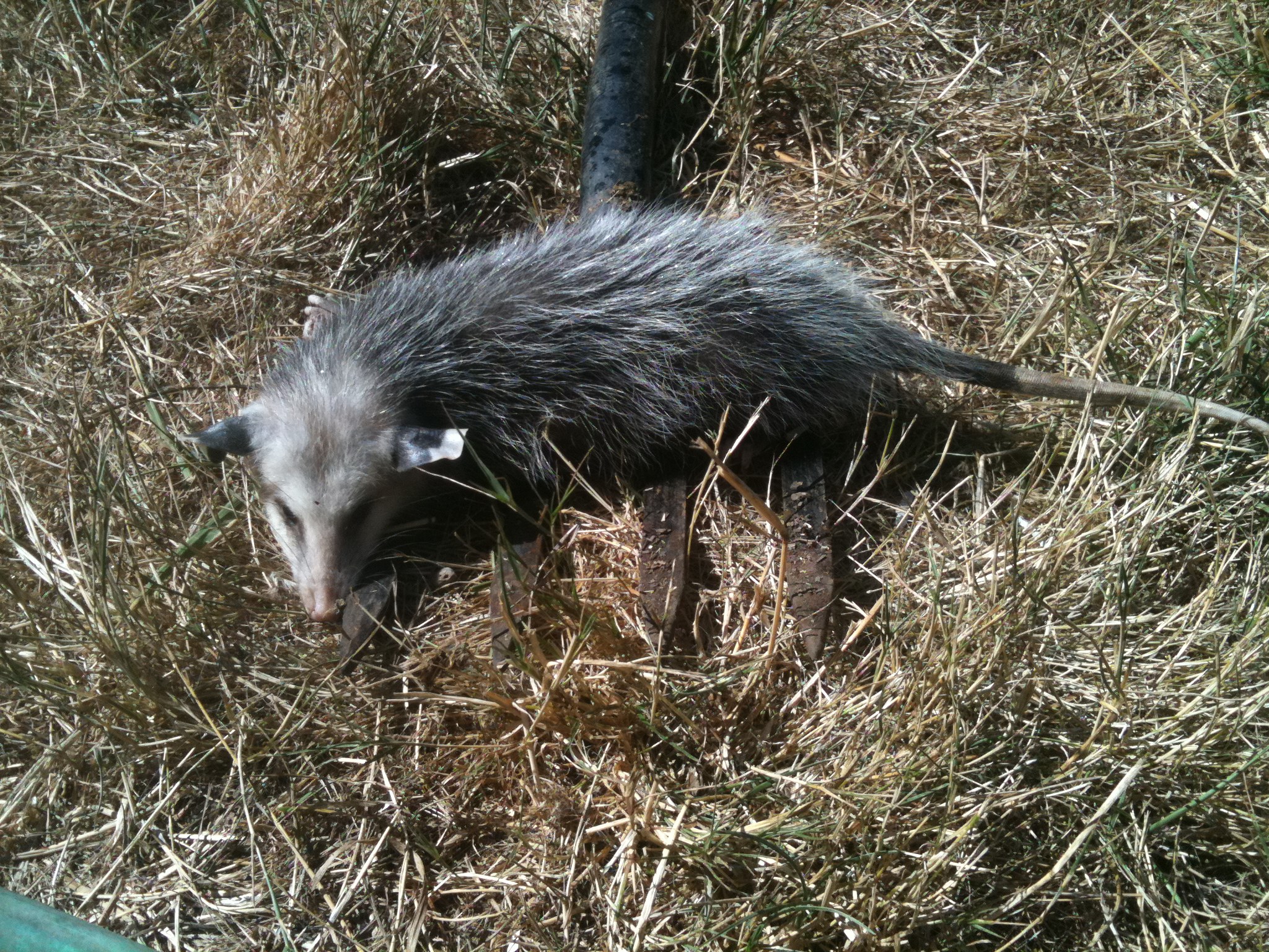 The opossum is still laying there. OK, according to Wikipedia, if it is “playing possum” the eyes will be closed at least partially – but they’re not. It also says that if it is “playing possum” it will be drooling/foaming at the mouth – but it isn’t. No smell either, and they usually excrete a smell when playing possum that makes a would-be predator think they’re already in the process of decaying. Hmmm. I think it’s an ACTUALLY dead opossum! So I use a pitchfork to pick it up (it’s stiff, but that is no indication of truly dead vs playing possum) and take it to the compost heap. Threw some compost over top of it to keep any smell away from the neighborhood stray cats. If it’s dead, it’ll stay there. If it’s not there tonight then I was taken in by a REALLY good player of “playing possum”!