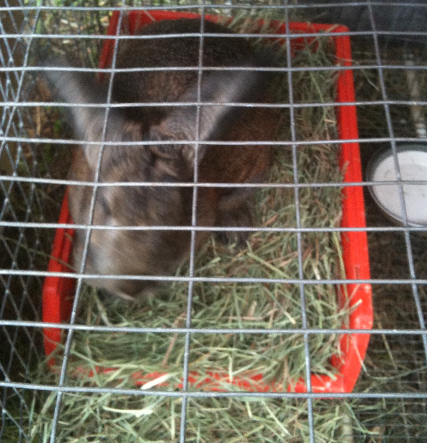 Go outside to put the nestbox full of hay in with the momma-to-be, and all the other rabbits race to the corner of their hutch that’s closest. Seriously? It’s hot and dry and you want HAY? Yep. So I go back to get the basket, fill it with hay, and bring it out to put some in each rabbit hutch. Momma is sitting in the nestbox on top of the hay, so hopefully she is bred. Most rabbits just sit beside the hay to eat it, not on top of it. Refill the water dish in the hutch of the new couple, in their game of chase they’ve knocked it over, but they’re both tired and thirsty now. Check on the opossum, it’s still in the compost. (Seriously, I am spending WAY too much time checking on this stupid animal that’s probably dead!)
