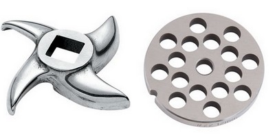 They are all parts to a meat grinder. Check this link if you want to see how they all fit together: http://www.meatbasics101.com/meat_grinders_02.htm You use a meat grinder to turn large chunks of roast into ground beef. (Or ground lamb, pork, etc – whatever you start with, obviously.) At my Goodwill, meat grinders and their parts are common enough that they’re usually found in the kitchen area where they belong.